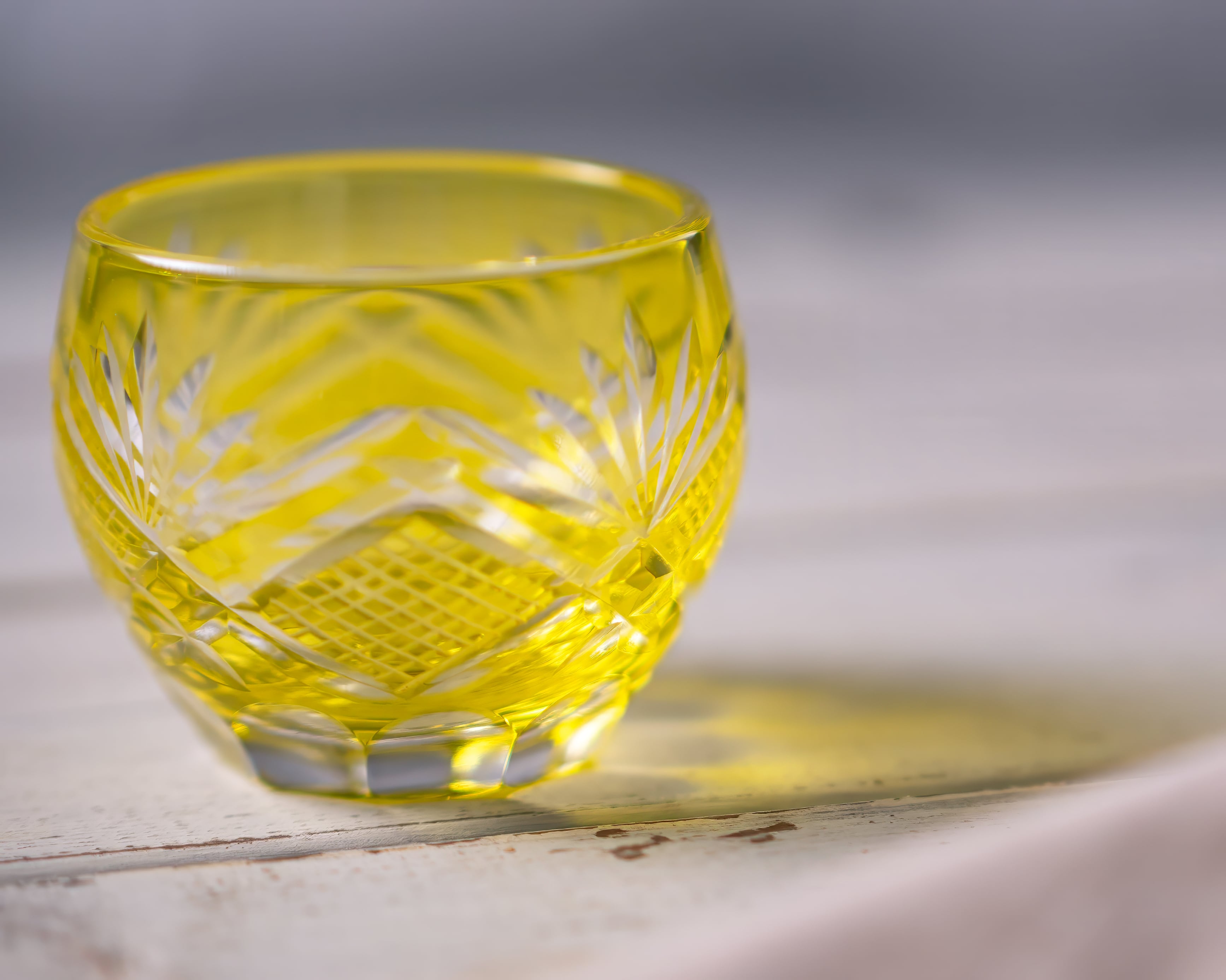This small Edo Kiriko cup captures light within its vibrant yellow form.