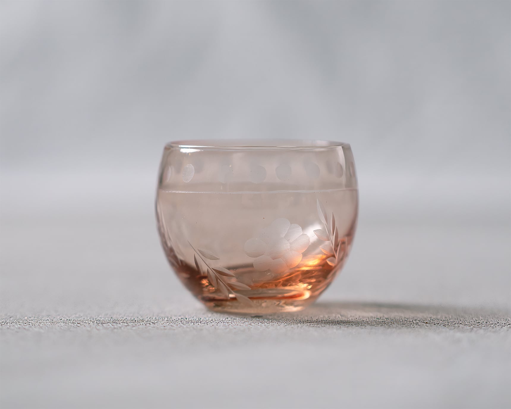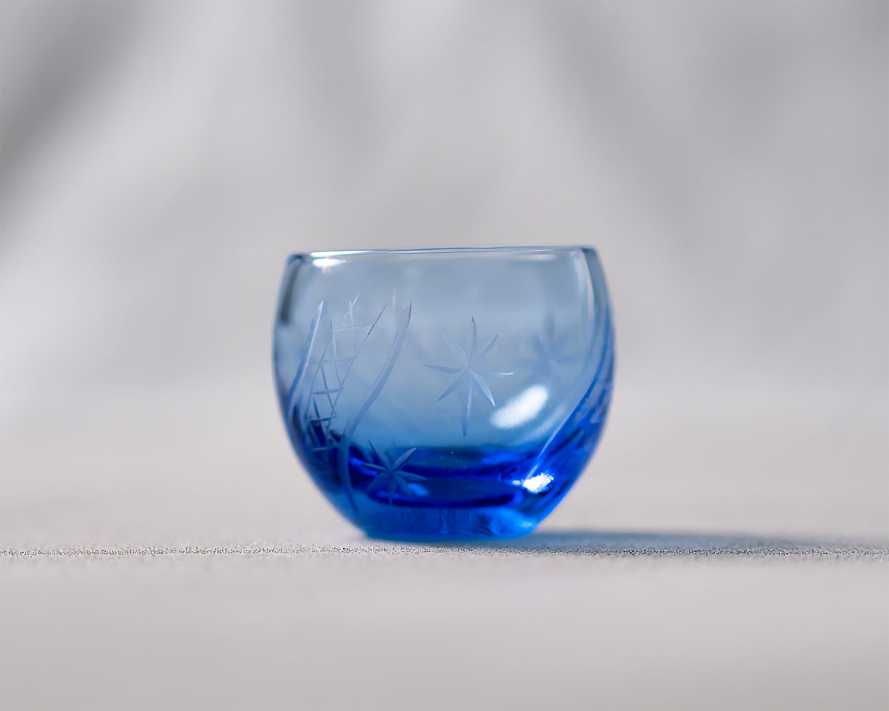 澄んだ硝子に、職人の手仕事が静かに刻まれた珍味入。切子のような華やぎを感じさせながら、どこかやわらかく、愛らしい表情。マットに仕上げた彫りが生む陰影は、透明な硝子に奥行きを与え、手のひらに収まる小さな器に静かな存在感を宿す。繊細な模様が光を受けてふわりと浮かび上がるよう。