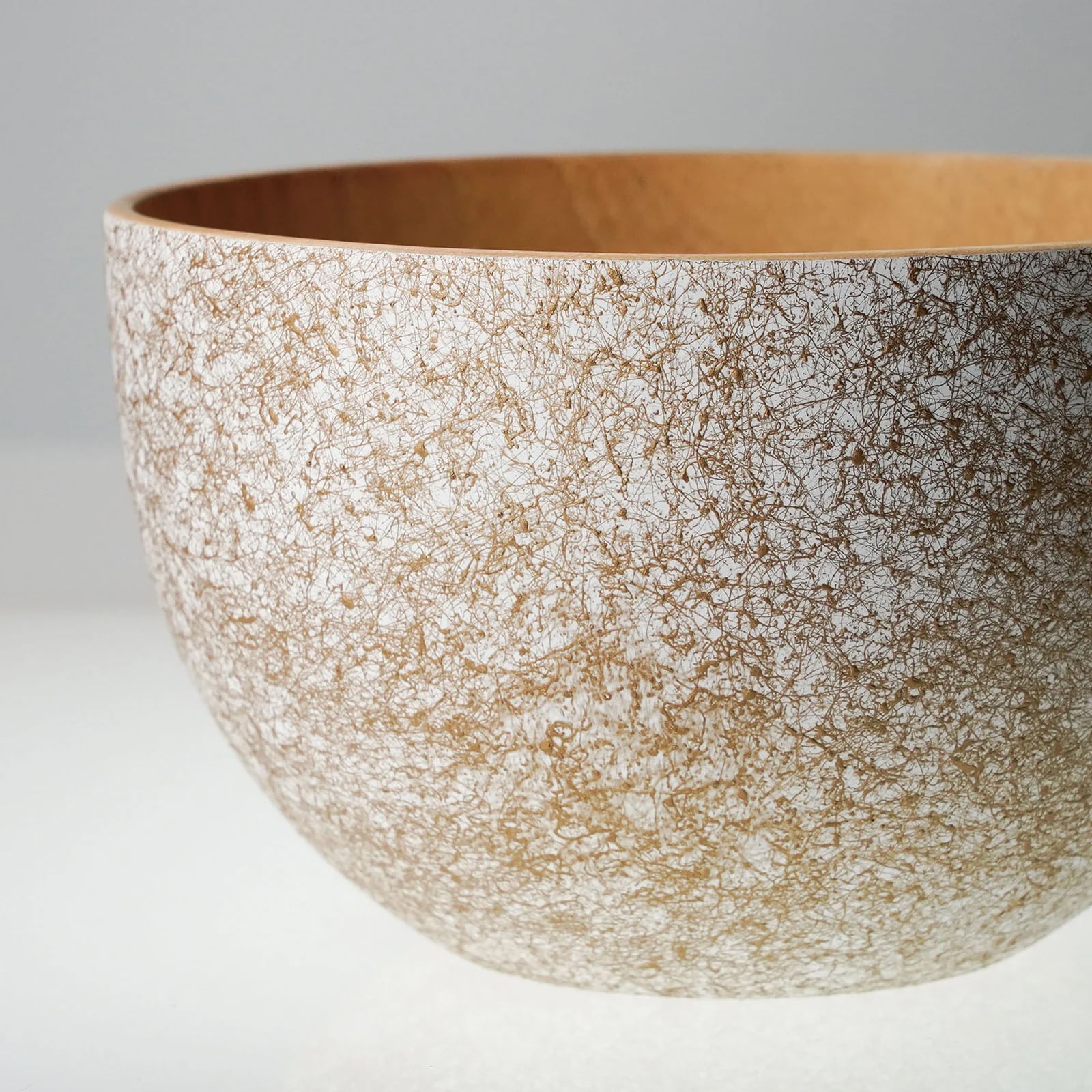 静かに凛とした空気感を纏いながら、細やかな金糸がふわりと舞う乱糸のボウル。 落ち着いたマットホワイトに金の糸を散らしたような繊細な模様が広がり、光を受けるたびに柔らかな陰影が生まれ、静かな気品を漂わせる。 内側には、木製ならではの自然な木目をそのままに。ガラス系の強化塗装を施すことで水分に強く、日常使いにも安心。静かな華やぎをまとい、日々の食卓にそっと品格を添える木の器。