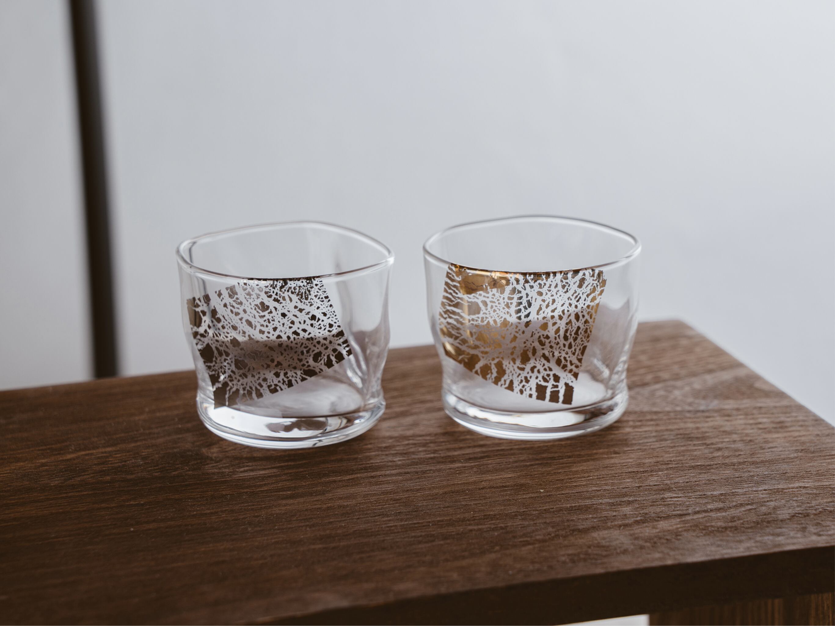 緩やかに流れる水の姿を硝子に映し、金箔の輝きを添えた盃。